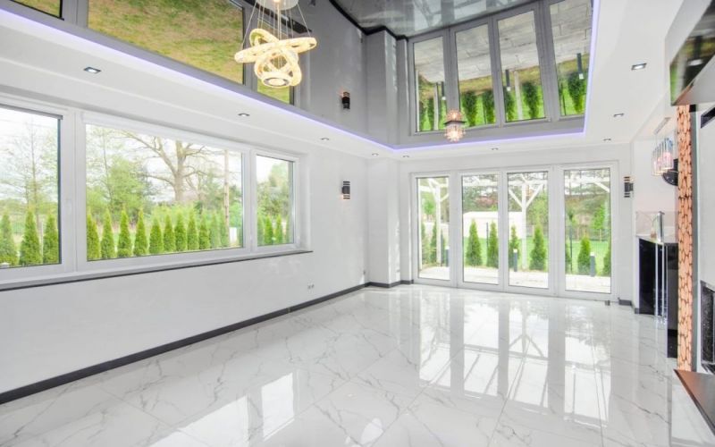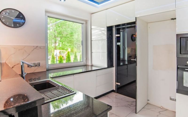 Wnętrze domu to piękny salon z aneksem kuchennym ,gdzie do wykonczenia kuchni użyto granitowych blatów z tego samego materiału użyto do zamontowanych parapetów z salonu mamy wyjście na klimatyczny taras